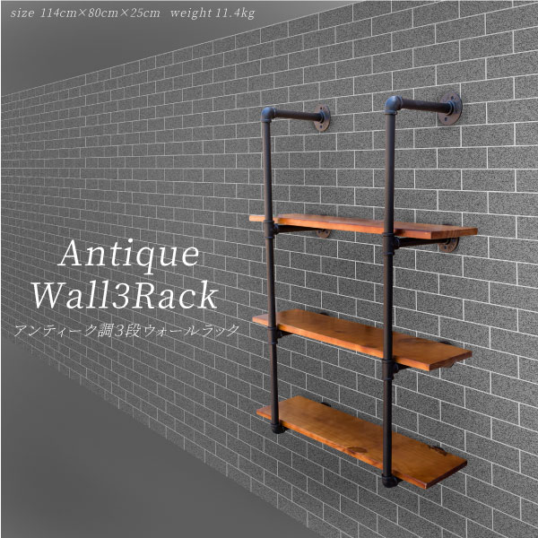 アンティーク調 家具 ウォールラック 3段 シェルフ 収納棚 木製 ウッド 組立式 壁付け 無垢木製 バッグ 鞄 靴 小物 帽子 本 写真 収納 整理 寝室 リビング シェルフ オシャレ レトロ 北欧 男前インテリア インダストリアル 大型送料 □_87232