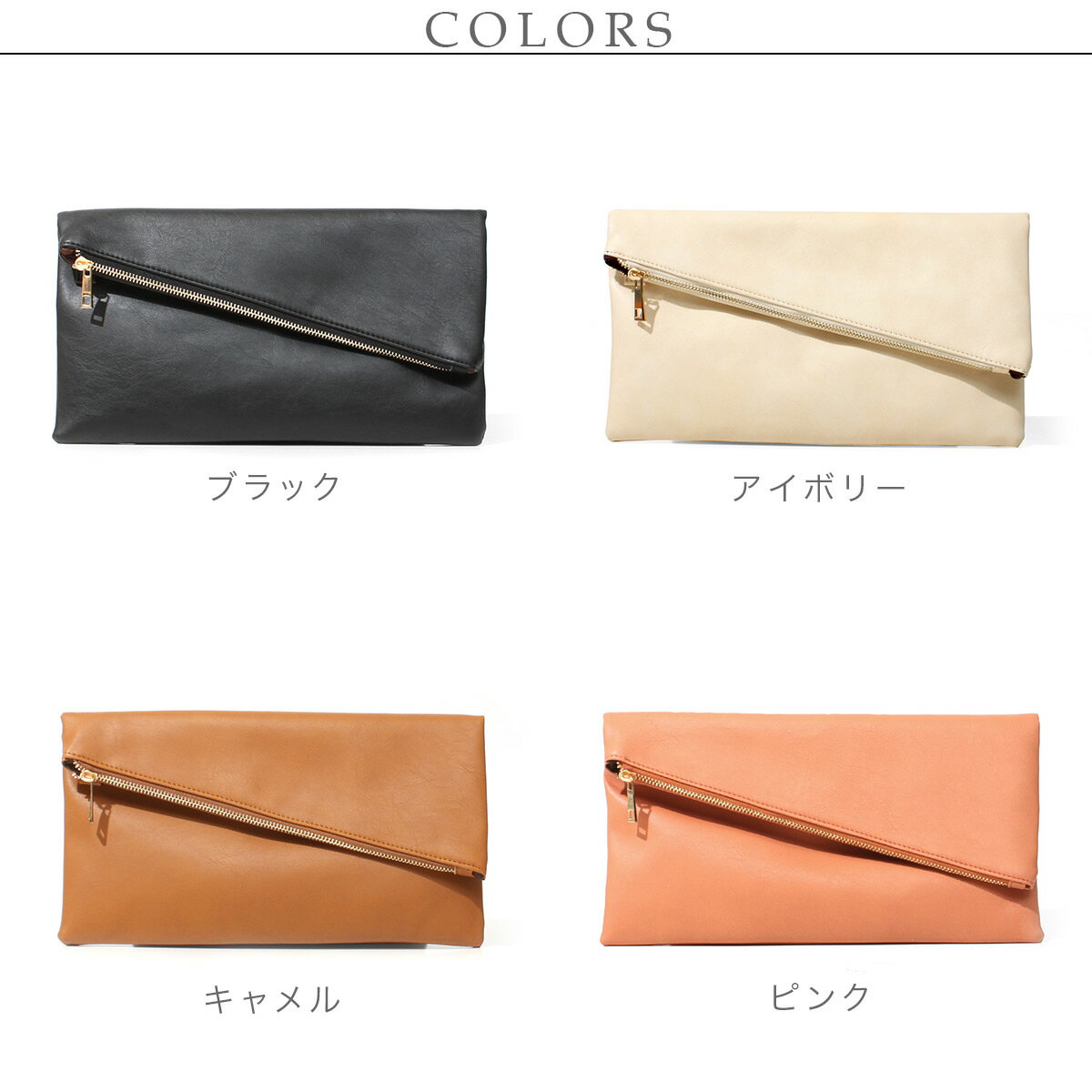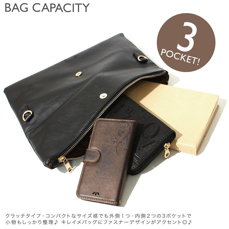 2WAYファスナークラッチバッグ レディースシンプルな口折れのクラッチにナナメにはいったZIPデザインがデザインアクセントになった2WAYクラッチバッグもつだけスタイルをぐっと上品な印象にフェイクレザーだから雨の日のお出かけもOK!柔らかなソフトレザーで持ったときの感触もGOOD!ゴールドの金具でクールに持てるのもポイント!コンパクトだから軽く、小物の整理もしっかりできるフェミニンな細ストラップ付きでショルダーにもなる2WAYの優秀さん【カラー】ブラック / アイボリー / キャメル / ピンクパーツカラー:ゴールド 【サイズ】タテ:18cmヨコ:31cmマチ:2cmショルダー長さ:65-125cm×1.5cm重さ:約265g【備考】メインスペース:ファスナー×マグネット開閉外:ファスナーポケット×1内:オープンポケット×2ショルダー取り外し・調整可 【素材】合成皮革【生産国】中国※モデル画像は環境光の影響によりカラーが異なって見える場合がございます平置きのカラー画像を御参考下さい。